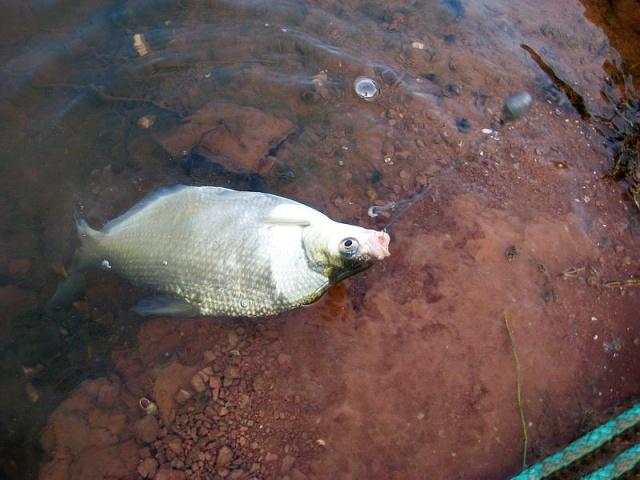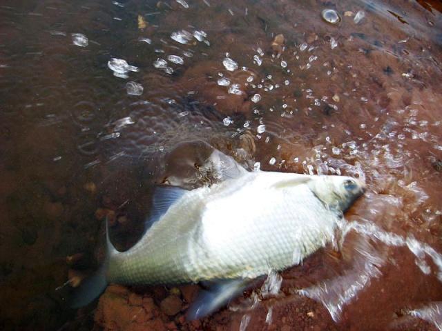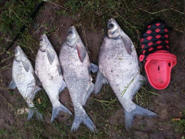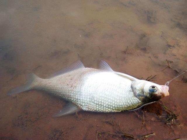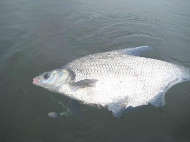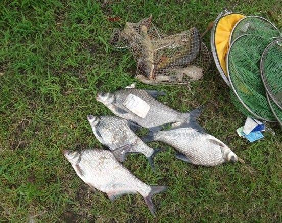 钓得参条数十尾,决定换鱼饵,刚丢下水,鱼饵刚刚要沉底的时候,鱼漂马上就有了送漂的反应,我立即提竿,顿感觉敢尖十分沉重,心里想:一定是大鱼!而且大鱼还有了开始向前方逃遁意向,我立即摆竿,向左,把鱼儿游出的方向控制起来,使鱼儿沿左岸方向游动,鱼儿一下子就被我拉出了水面,定睛一看原来是一条大鳊鱼。