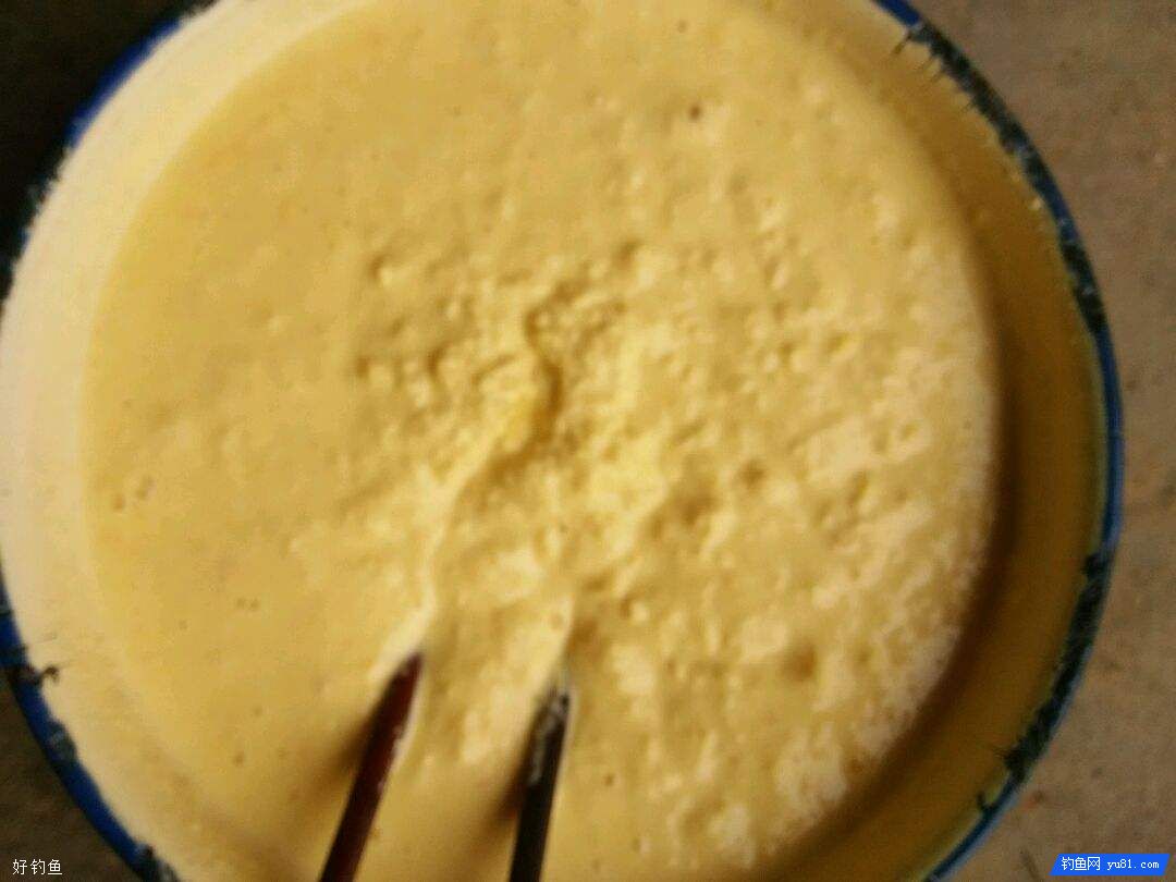5.拿去钓鱼时,取部分玉米浆糊加入适量的超诱(鱼具店有售)和拉丝粉、水调和,调和好以后的状态,以又稀又粘为好。
