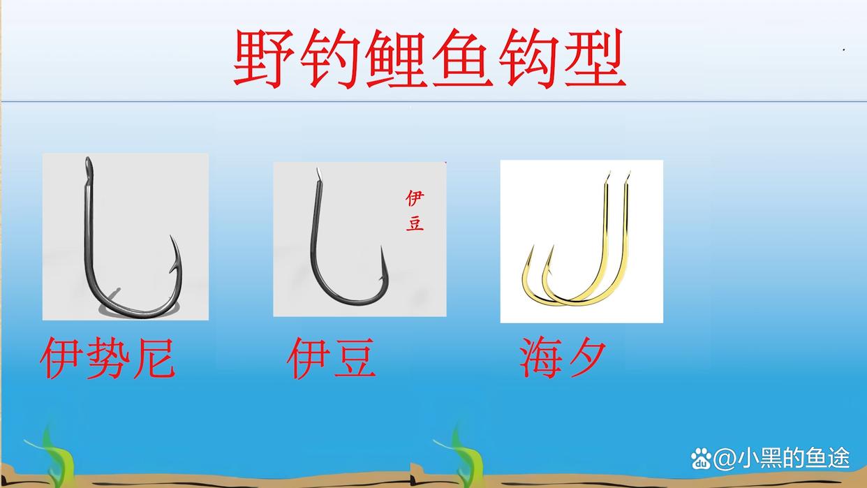 结合鲤鱼这2个特点,最常用的钩子类型有4种,第一种是伊势尼,第二种是伊豆,第三种是海夕,第四种是新关东。这4种鱼钩无论是钩宽、钩深以及结构强度都非常的合适。