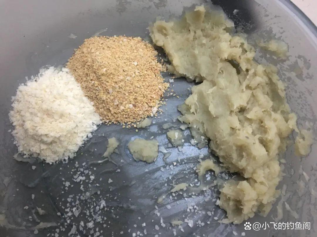 这个配方去年分享过,不知道有没有人记得,它其实和上述第三个配方有点像,无非多了黄豆粉和芝麻粉而已,这两种东西是增香的,对鲤鱼的诱惑力很强。但我一般更愿意用上述第三个,因为更简单、成本更低。此配方的做法是:黄豆炒香、打碎(可以直接买炒香的黄豆粉),取50毫升,再加20毫升的熟芝麻粉,30毫升的熟玉米粉。这三样东西混合均匀以后,再加入一个熟红薯,红薯的量和这三样饵料加起来的量差不多就行。有条件的可以加点蜂蜜或者白糖,这个可以多加,不会死窝。此配方针对鲤鱼、大个体鲫鱼都有很好的效果,适合春末,夏季、秋季使用。